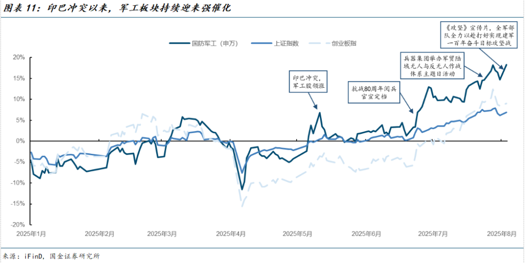 行业重大事件不断,军工板块持续出圈:1)5月:歼-10CE、PL-15E等在印巴冲突中表现突出,板块热度陡增,呈现脉冲式上涨;2)6月:月底官宣80周年阅兵,指数快速上行;3)7月:月底兵器集团举办主题日活动,无人与反无主题股表现强势;4)8月:《攻坚》纪录片首播,军工板块行情持续。