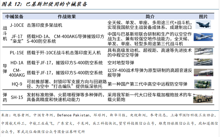 在印巴实战中,巴基斯坦军队使用了我国多种先进装备,是我国军工体系化作战能力的集中体现。自5月7日印度发动“朱砂行动”以来,先后对巴基斯坦发动多次导弹袭击、无人机入侵等行动施压,冲突过程中,巴基斯坦使用歼-10C、PL-15等中械装备,击落印度3架法制“阵风”战机、1架俄制米格-29、1架苏-30和1架“苍鹭”无人机,出动中巴合作研制的JF-17“枭龙”战机携带中制HD-1A导弹摧毁印度S-400防空系统。