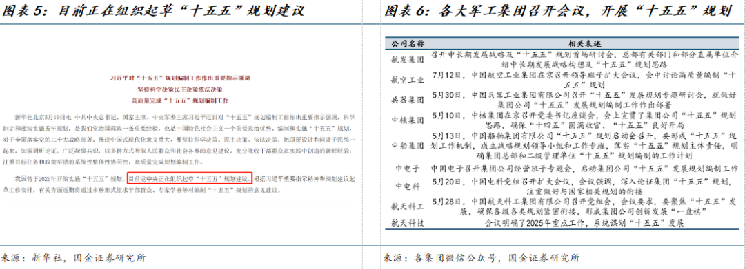 “十五五”规划开启,军工发展注入强确定性。1)中央层面:2025年5月19日,习近平对“十五五”规划编制工作作出重要指示,目前党中央正在组织起草“十五五”规划建议。2)各军工集团:航空工业、航发集团、兵器集团等军工集团陆续召开“十五五”发展规划编制推进会/研讨/会谈,标志着各集团已进入实质性的规划论证阶段。我们认为,“十五五”规划的开启,会对今后军工发展注入更强的确定性。