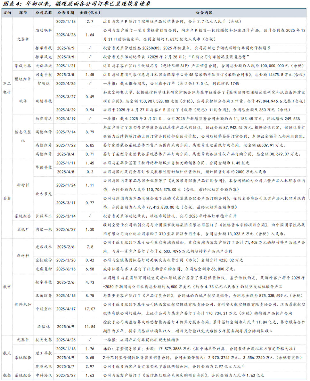 十四五收官务期必成,看好行业景气反转:今年年初以来,多家公司订单呈现密集恢复迹象。订单是业绩兑现的根基,后续有望逐季反映到公司报表端,订单方向主要集中在军工电子和兵器产业链。除大额合同外,部分公司在公告中提及2025年相关订单呈增长态势,主要包括军工电子上游元器件和模块组件、导弹系统配套、航空新材料和主机厂。从近期军工板块的中报业绩预告来看,北方导航、高德红外、火炬电子、鸿远电子、芯动联科、长盈通等中报同比大幅增长,更多公司有望在下半年加速好转。